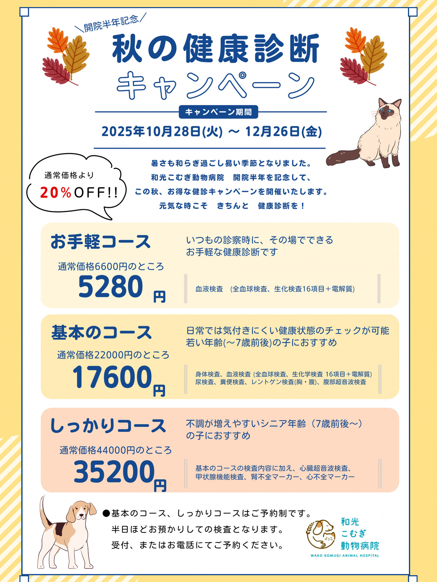 和光こむぎ動物病院の3つの健診コースが、通常価格より20%OFFでお受けいただけます。